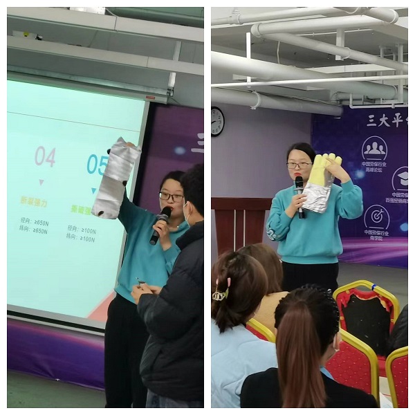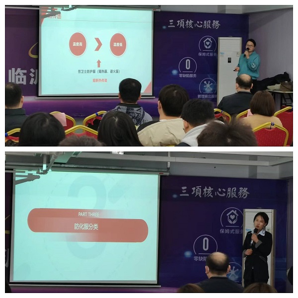 培訓(xùn)持續(xù)了40分鐘左右,盧經(jīng)理與王經(jīng)理在講臺(tái)上詳細(xì)的講解產(chǎn)品賣點(diǎn),并且對(duì)產(chǎn)品材質(zhì)等進(jìn)行了隔熱“試驗(yàn)”,我司銷售團(tuán)隊(duì)家人在臺(tái)下專心致志的傾聽,因?yàn)槲覀兒惆踩酥乐挥挟a(chǎn)品了解的清楚透徹,才能更好的服務(wù)我們的客戶、才能更好提升我們恒安的整體力量,才能更好的保障每位勞動(dòng)者的生命安全。